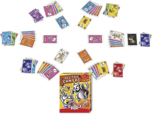 Zwei Vögel liegen auf dem Tisch? Dann lohnt sich das Ausspielen einer Katze. Oder besser doch der Hund, um die gegnerischen Katzen zu erlegen? Ich denke, du denkst … All You Can Eat ist betont glückslastig, außer man merkt sich jede einzelne ausgespielte Karte. Auf alle Fälle scheint es eine lockere Angelegenheit zu sein, flott und lustig, fast könnte man es als Kinderspiel bezeichnen. Fast: denn der konkrete Ablauf ist doch nicht so locker-leicht. Damit es reibungslos funktioniert, sollte man das Spiel ernst nehmen – ansonsten muss immer jemand aufpassen, dass der Rhythmus stimmt. „Nein, nicht der Hund frisst, erst der Vogel!“ „Wieso, ich dachte beim Startspieler beginnend?“ „Die Tiere in der Mitte fressen nichts, die werden gefressen!“ So erweist sich dieses lebendige Kartenspiel als weniger intuitiv als zunächst gedacht.