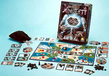 Alan R. Moon und Aaron Weissblum sind das Überraschungsteam des Jahres 2001, die zunächst mit Capitol und San Marco viel Aufmerksamkeit auf sich gelenkt haben. Auf den allerersten Blick scheint das Amulett mit diesen beiden Titeln sogar eine Ähnlichkeit zu haben. Doch das Aufatmen stellt sich schnell ein: Es geht in den Gebieten auf dem Spielplan nicht um Mehrheiten, sondern es sind Orte für die Versteigerung. Auch wenn die thematische Umsetzung vielleicht nicht ganz so überzeugend ist das Amulett ist das originellste und beste der drei Moon/Weissblum-Spiele.