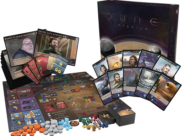 Dune vereint Deckbuildung, Workerplacement und Ressourcenmanagement. Aus den fünf Handkarten wählt man zwei, deren Symbol mit einem Spielbrettfeld übereinstimmt. Dorthin stellt man seinen Worker – der hier Agent heißt. Manchmal muss man dafür mit Solari (das dortige Geld), Wasser oder das sagenumwobene Spice, ein bewusstseinserweiterndes Gewürz, bezahlen. Als Belohnung bekommt man Truppen oder wiederum Solari, Wasser oder Spice. Zum Schluss deckt man die drei restlichen Spielkarten auf und addiert deren unten stehende Ziffern zu einem so genannten Überzeugungswert: damit kauft man eine neue Spielkarte, die man aus der Auslage wählt. Diese kommt dann zum eigenen Kartenstapel – dem Deck –, dessen Qualität man verbessern möchte.
