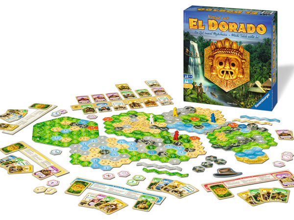 Er hat zwei Spielelemente auf vorzügliche Weise miteinander verknüpft. Da ist das Brettspiel, das aus doppelseitig bedruckten Streckenelementen besteht, so dass für jede Partie ein neuer Weg gestalftet werden kann. Aber letztlich ist so ein Wettrennen nichts wirklich Besonderes. Gleichzeitig ist El Dorado ein Kartenspiel, dessen Grundzüge von Dominion übernommen wurden, dem Spiel des Jahres 2009. Dessen Prinzip, sich im Laufe des Spiels einen eigenen Kartenstapel zu „bauen“, ist genial – und das färbt auf El Dorado ab.
