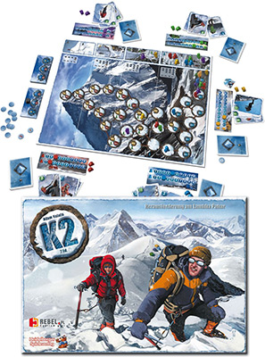 Der Aufstieg ist mühsam. Zuerst erschien K2 in einem kleinen polnischen Verlag namens Rebel.pl und wurde zu einem Geheimtipp der Essener Spieltage 2010. Ein halbes Jahr später nahm der Heidelberger Spieleverlag den Titel in sein Vertriebprogramm auf, womit das Spiel auch im deutschen Handel erhältlich war. Und mit der zweiten Edition, die den Untertitel Herausforderung am Lambha Pahar trägt, gibt es ab Herbst 2011 eine spezielle Ausgabe für den deutschen Markt. Die Heidelberger sind jetzt nicht mehr nur für den Vertrieb zuständig, sondern übernehmen auch verlegerische Verantwortung, in dem sie das Spiel gemeinsam mit Rebel.pl herausgeben. Großer Erfolg wurde dem Bergsteigerspiel zu teil, als es 2012 mit einer Nominierung für das Kennerspiel des Jahres ausgezeichnet wurde.