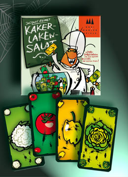 Kakerlakensalat ist tolles flottes Kartenspiel, das überhaupt nicht so kindlich ist, wie es die Altersangabe „ab 6“ suggeriert. Sondern es ist ein vollwertiges Erwachsenenspiel, das manch Einen an den Rande seiner Konzentrationsfähigkeit bringt. Deswegen hat es gute Chancen auf den Deutschen Kinderspiele Preis – weil es das Kinderspiel ist, das Erwachsene am liebsten spielen.
