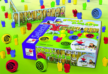 Dass bei CURLI KULLER auf dem Boden gespielt wird, begeistert die Kinder schon vor dem Start des Spiels. Pappelemente markieren ein etwa 60 mal 60 Zentimeter großes Spielfeld. Dort werden 40 Spielfiguren bunt gemischt aufgestellt, und die Vogelscheuchenfigur kommt in die Mitte. Jetzt nimmt das erste Kind die Holzrampe und lässt dort die Schnecke – ein dickes Holzplättchen – hinunterrollen. Dabei soll die rollende Schnecke möglichst viele Spielfiguren der eigenen Farbe umwerfen. Denn diese Salatpflanzen zählen für den Sieg. Über umgefallene Figuren in den gegnerischen Farben freuen sich die Mitspieler.