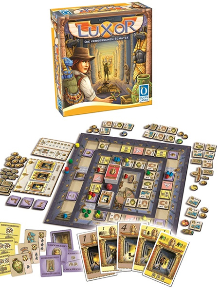 Das Rennspiel ist eine Spielidee, die zwar schon unzählige Male umgesetzt wurde, die aber immer noch begeistert. Jedenfalls dann, wenn sie so klug umgesetzt ist wie bei Luxor. Spielkarten sind der Motor für die Figuren: Fünf Karten habe ich auf der Hand – darf aber nur die rechte oder linke Karte nutzen. Die neu nachgezogene Karte muss ich jeweils in die Mitte stecken. Kartensortieren ist verboten, das erinnert an Bohnanza, und diese ungewöhnliche Idee gefällt auch bei Luxor.