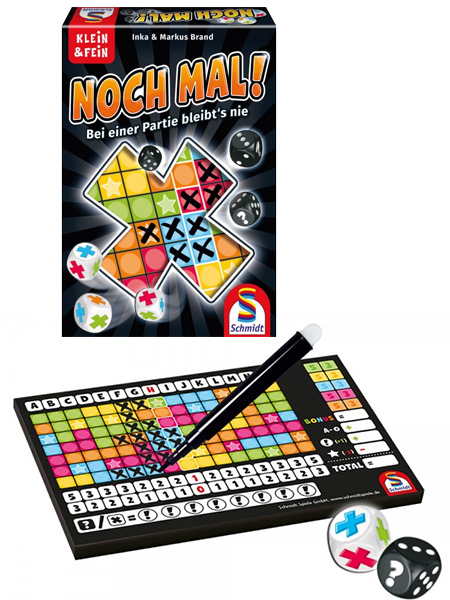 Der eine Spieler würfelt und sucht sich zwei der sechs Würfel aus. Die Mitspieler haben dann jeweils vier Würfel zur Auswahl. Sie können zeitgleich entscheiden, welche sie verwenden. Damit lässt sich Noch mal auch zu dritt oder zu viert flott spielen. Besonders geeignet ist der Titel jedoch in der Zwei-Personen-Konstellation.