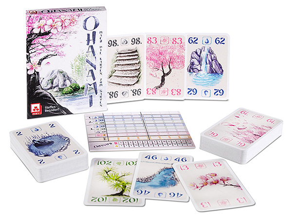 „Mach die Karten zum Garten“ fordert uns Ohanami poetisch auf, für gärtnerische Ordnung zu sorgen. In der japanischen Gartengestaltung ist der Zufall nämlich nicht so gerne gesehen, sondern alles muss ordentlich sein. Steffen Benndorf hat sich der Idee seines Klassikers The Game angenommen und daraus einen Wettbewerb mit Draftingelementen gemacht. Zehn Karten bekommen jeder von uns auf die Hand, sucht zwei davon aus, legt sie auf den Tisch, und gibt die übrigen acht Karten seinem Nachbarn. Das machen wir solange, bis wir jeweils zehn Gartenkarten haben. Unterbrochen Zwischenwertungen wiederholt sich das, bis unsere persönliche Anlage aus bis zu 30 hoffentlich bildschönen Karten besteht.