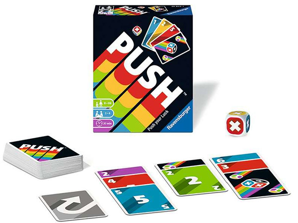 Wer über Brett- und Kartenspiele redet, kann versuchen, seine Gesprächspartnerinnen und -partner mit möglichst englischsprachigen Fachbegriffen zu beeindrucken. Area Control, Worker Placement, Roll and Write und so weiter. Push ermöglicht es auch Laien, fundiert mitzureden, denn Ravensburger hat es auf den Schachteldeckel geschrieben: Push your Luck heißt das Spielprinzip. Das ist so etwas Ähnliches wie Black Jack oder 17 und 4 – profan gesprochen.