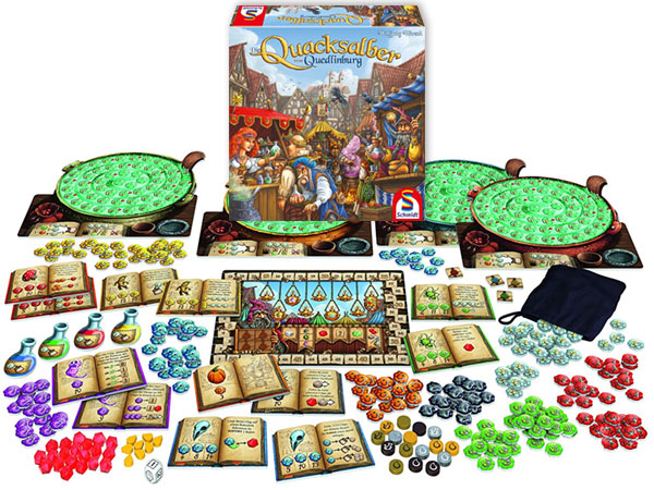 Das Beste an dem großen Quacksalber-Paket, das zunächst exklusiv bei Aldi (Nord und Süd) in den Handel kommt, ist das Material und die Regelmodifikation für eine zusätzliche fünfte Spielerin. Da man hier weitgehend gleichzeitig in seinem Beutel grabbelt, ist das absolut lohnend. Während bei anderen Spielen mit zunehmender Spielerzahl die Wartezeiten verlängert werden, besteht in Quedlinburg diese Gefahr kaum.