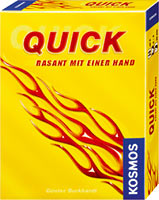 Jetzt gibt es auch bei Kosmos Kartenspiele im Kleinformat. Bei Quick erinnert nicht nur das Format sondern auch die gelbe Farbe an die Amigo-Bestseller Bohnanza und 6 nimmt. Die Quick-Spielkarten selbst sind allerdings nicht schachtelfüllend, sie sind etwas kleiner. Ein Tütchen Siegpunktchips ergänzt das Kartenspiel.