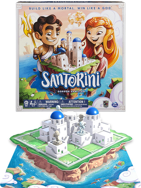 Erschienen ist Santorini beim kanadischen Kleinverlag Roxley. Ursprünglich hatte es ein bildschönes Cover, das in der vom ebenfalls kanadischen Spielwarenkonzern Spin Master vertriebenen Ausgabe leider verschandelt wurde. Überdimensionierte Warnhinweise, dass Kleinkinder hiermit nicht spielen dürfen, prangen in englischer und französischer Sprache auf der Schachtel. So ist kaum zu erkennen, dass es sich bei der bei uns erhältlichen Ausgabe um ein deutschsprachiges Spiel handelt. Ärgerlich ist auch die Schachtelangabe, dass Santorini für zwei bis vier Spielerinnen und Spieler geeignet sei. Denn eigentlich ist es ein lupenreines Zwei-Personen-Spiel: und zwar ein wirklich gutes.
