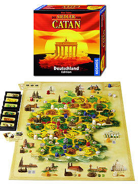 Zwar könnte man annehmen, dass ein Spiel mit derart vielen Erweiterungen, Varianten, Spin offs und so weiter nicht mehr verbessert werden kann. Doch da kommt die Deutschland Edition. Dass die beeindruckende Michael-Menzel-Grafik die eher puristische (aber übersichtlichere) Ur-Siedler-Fassung schlägt, war vorauszusehen. Gekrönt wird die Ausstattung durch 12 prächtige Wahrzeichen vom Brandenburger Tor über die Wartburg bis hin zum Kölner Dom. Diese Figuren sind goldfarben und kosten gerade mal zwei Erz und ein Getreide. Das mühevolle Sparen bei den Standard-Siedlern, bei denen die Städte viel teurer sind, entfällt. Langfristigen Ertrag bringen die Wahrzeichen jedoch nicht, stattdessen gibt es eine Ein-Mal-Belohnung, etwa in Form einer Straße.