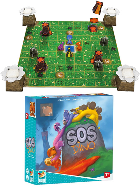 Dramatisch ist die Szenerie bei SOS Dino. Die Vulkane brechen aus und unsere sympathischen Dino-Figuren drohen von der Lava verschluckt zu werden. Immer wenn ein Lavaplättchen gezogen wird, muss es an den passenden Vulkan, der sich auf dem 11 mal 11 Felder großen Spielplan befindet, angelegt werden. Gleichzeitig spendiert das Lavaplättchen den Saurierfiguren ein oder zwei Bewegungspunkte. Sie möchten nämlich zunächst zu den Eiern laufen, um diese zu retten, und anschließend selbst eine der vier rettenden Plattformen in den Ecken des Spielbretts erreichen.