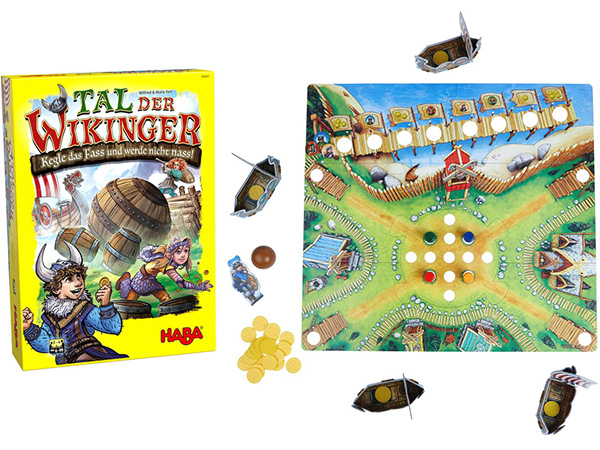 Auf dem Spielbrett hat jeder Mitspielende ein farbiges Fass, und reihum rollen wir eine Kugel, um diese Umzuwerfen. Das ist wie beim Kegeln, die Kugel ist groß und schwer genug, damit das richtig Spaß macht. Vorm Kegeln habe ich die Möglichkeit, die zuvor umgefallenen Fässer so zu gruppieren, dass ich einige gut treffen kann – und andere stehen bleiben. Das Spiel hat nämlich eine taktische Komponente. Es macht Sinn, vielleicht nur rot und grün umzuwerfen, blau und gelb aber nicht. Der Grund dafür befindet sich am Rande des Spielbretts. Dort bewegen sich vier runde Pappplättchen – die vier Wikinger – entlang eines Stegs. Immer dann, wenn das dazugehörige Fass umfällt, geht es einen Schritt oder per Überspringen sogar noch weiter. Sobald ein Plättchen das Stegende überschreitet und ins Wasser fällt, wird die Wertung ausgelöst. Der schwimmende Wikinger geht leer aus, und die auf dem Steg befindlichen bekommen Münzen aus der Kasse oder können sie vom Gegner rauben. Wie viel man gewinnt ist abhängig von der Position auf dem Steg.