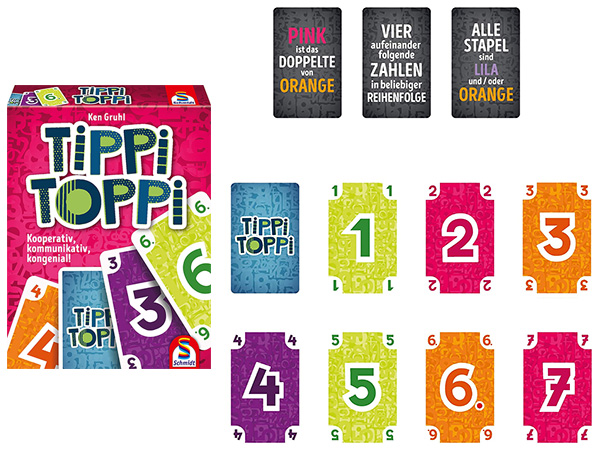Tippi Toppi lädt insbesondere zum lockeren Spielen ein. Anders als bei The Game, wo es ein perfektes Ziel gibt, ist hier die zu erreichende Zielzahl eh willkürlich gewählt. Und deshalb freut man sich bereits über alle Zwischenschritte, die man am dem Weg dahin bewältigt. Zum lockeren Spiel passt die lockere Anleitung. Sie gibt zur Interpretation der Aufgabenkarten keine Hilfestellung, folglich muss man auch nicht zwischendurch nachblättern. „Zwei abwechselnde Stapel lila“ ist zwar eine etwas rätselhafte Herausforderung. Aber man kann die Auslegung im Laufe des Spiels problemlos diskutieren und vereinbaren, ohne dass man das Gefühl hat, man würde damit den Gegner hintergehen. Tippi Toppi verzeiht vieles. Gemein ist das Spiel in nur ganz seltenen Fällen