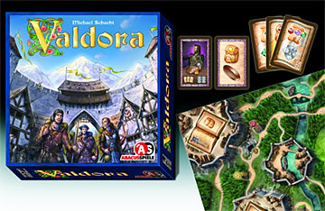 Valdora ist schon auf den ersten Blick ein recht beeindruckendes Spiel. Das Spielbrett ist bunt und attraktiv gestaltet und in den Städten sorgen die „Bücher“ für Aufmerksamkeit. Holzständer sorgen dafür, dass Spielkarten wie ein Buch aufgeschlagen werden.